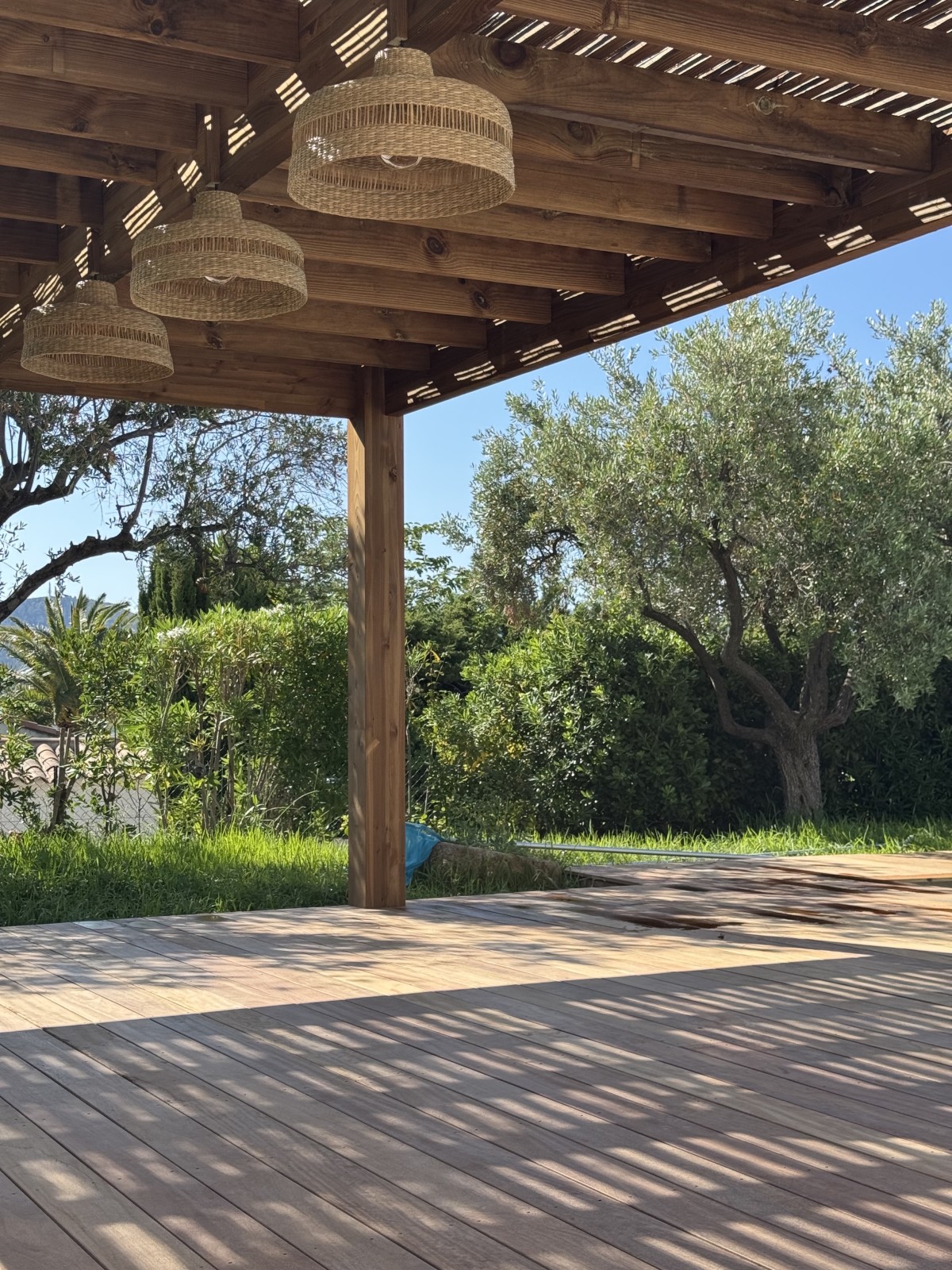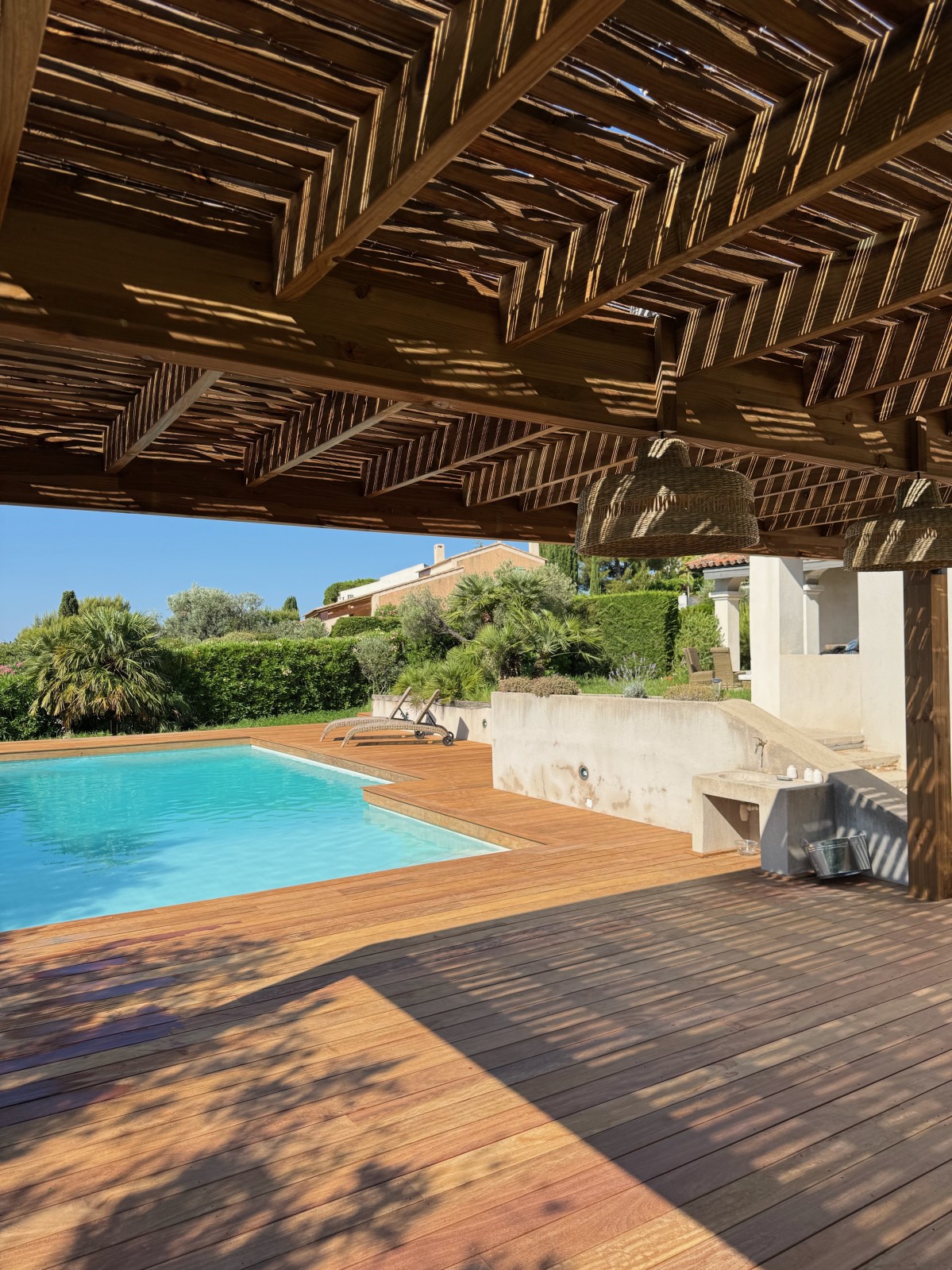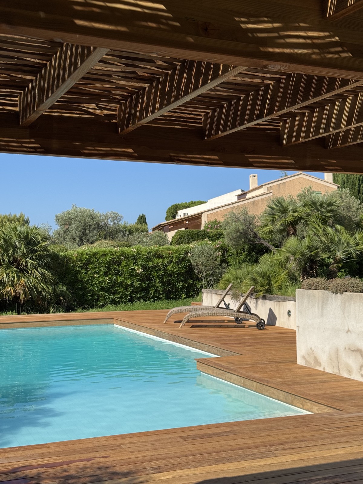 Nous avons créé et installé une pergola en Douglas marron sur mesure en bordure de piscine, pensée pour offrir un espace d’ombre et de détente dans un extérieur situé à Cassis.