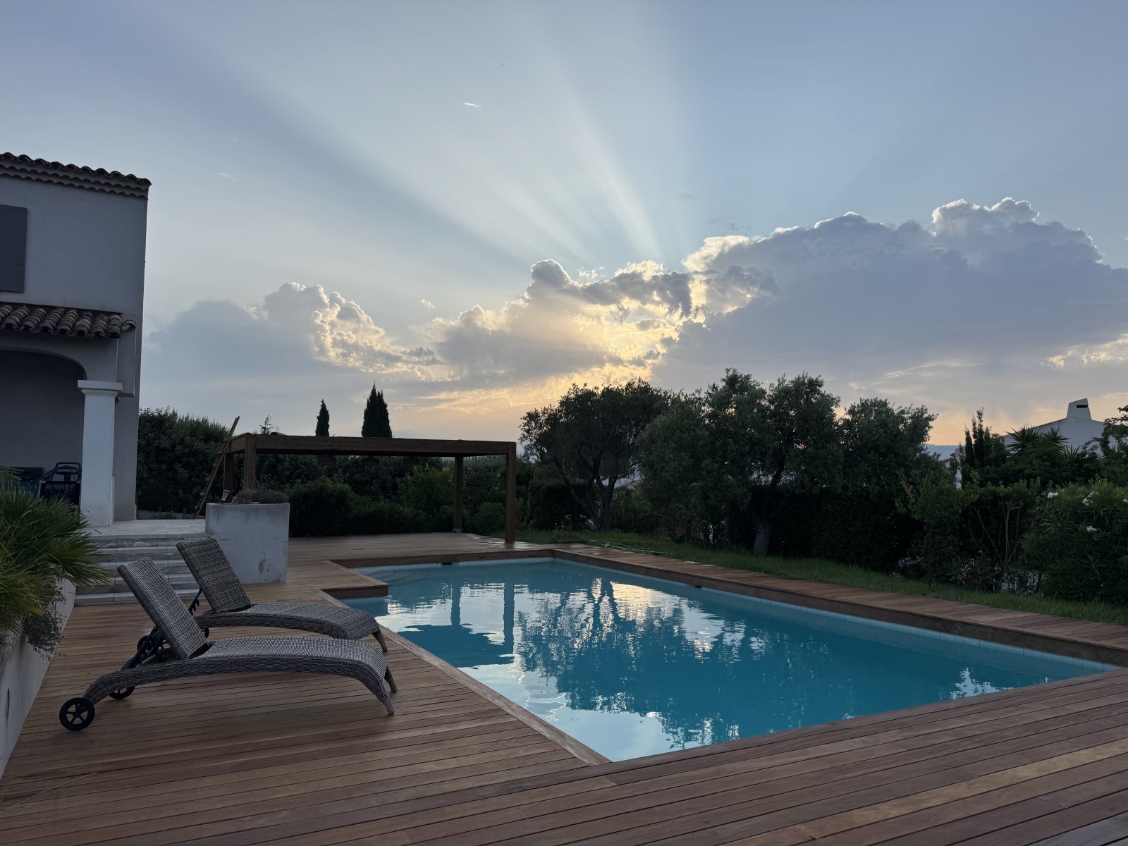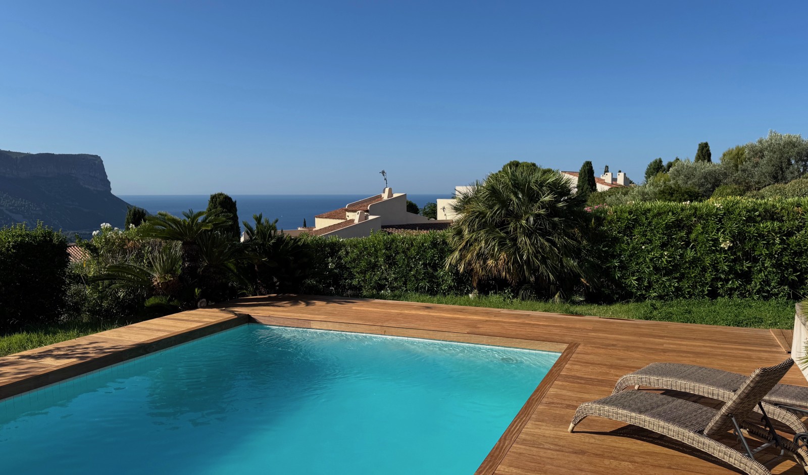 Nos clients, propriétaires d’une villa nichée dans les hauteurs de Cassis, souhaitaient redonner vie à leur espace piscine, jusque-là recouvert d’un carrelage usé. L’objectif : créer une zone de repos chaleureuse, esthétique et durable, entièrement conçue en bois exotique Cumaru.