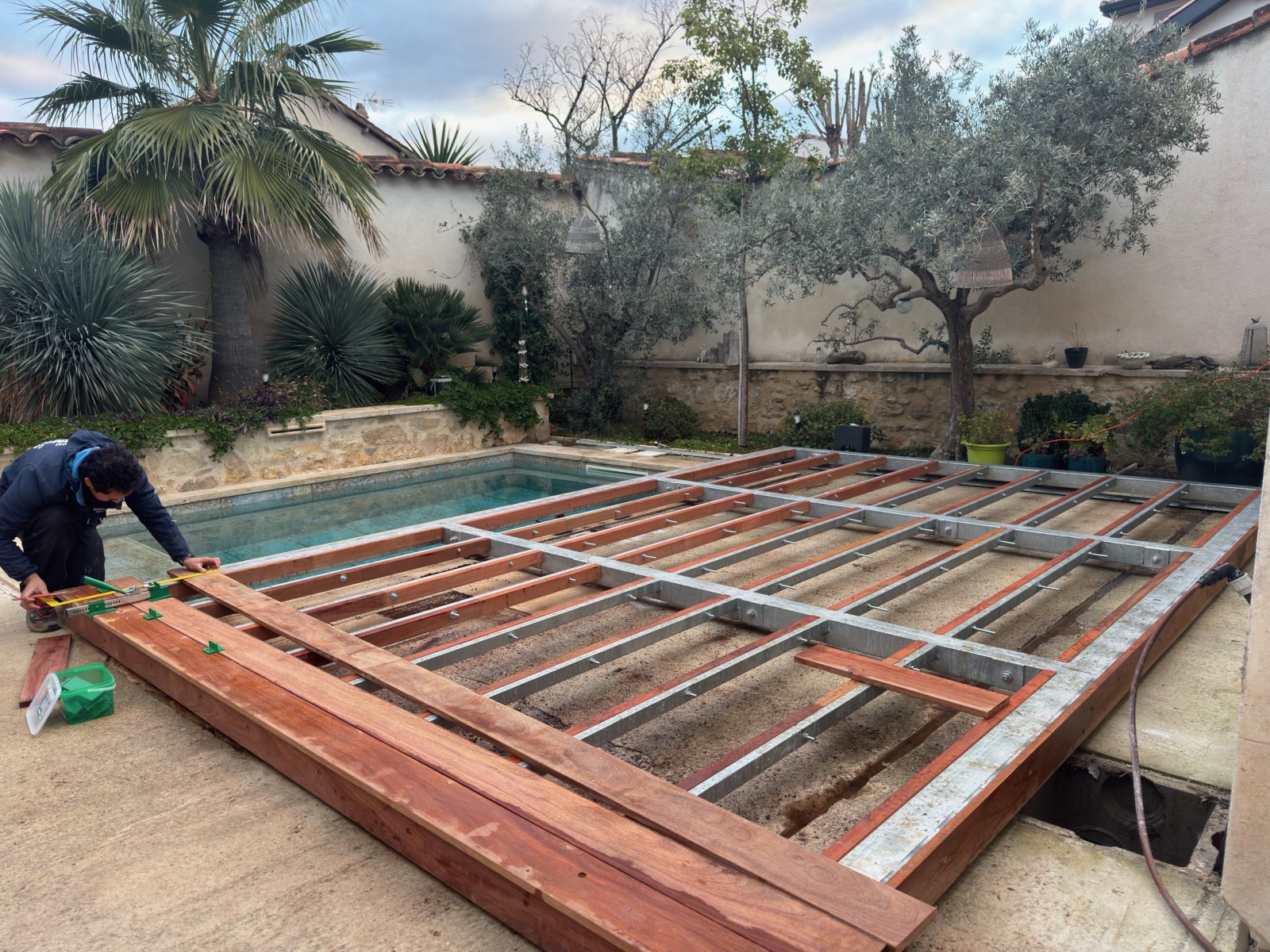Terrasse coulissante en bois exotique alliant esthétisme, sécurité et ingénierie sur mesure à Rognac.